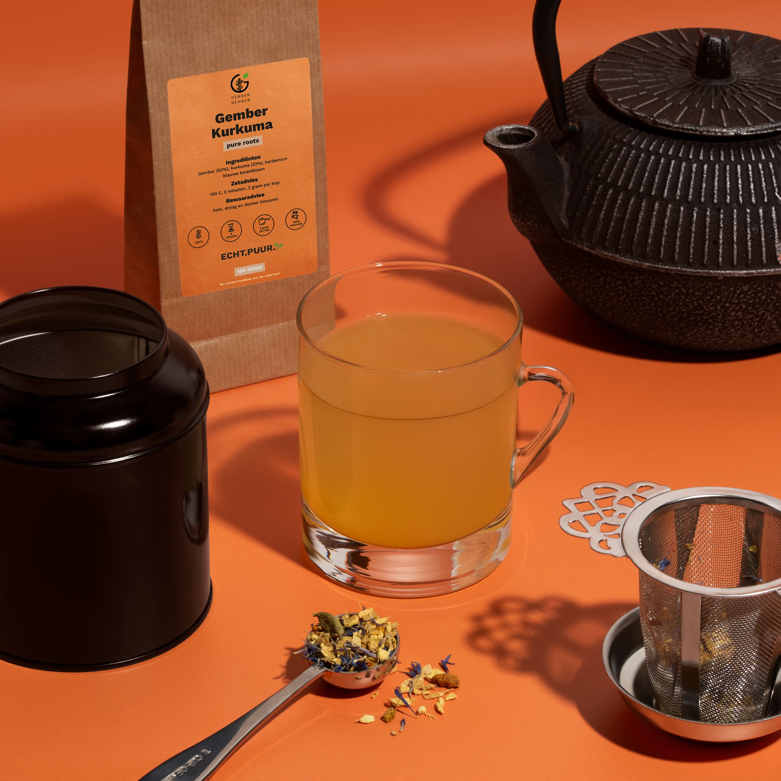 Ingrediënten: Gember (62%), kurkuma (32%), kardemom, blauwe korenbloem.
