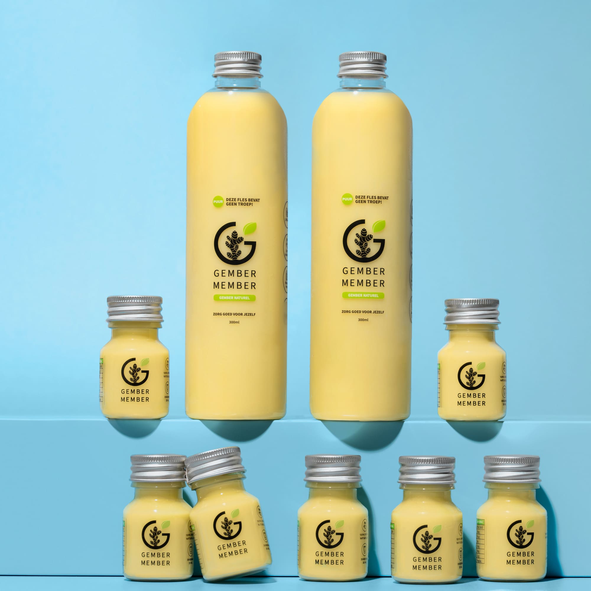 Gember bevat dit van nature. Het bezinksel wat je ziet in ons gembersap geeft aan hoe natuurlijk en vers ons sap is. ECHT.PUUR. is de kracht van Gember Member. Goed schudden en het bezinksel mengt zich met het sap en is klaar om te shotten 😉 Tip: vergeet niet om altijd een glas water te nuttigen na de shot