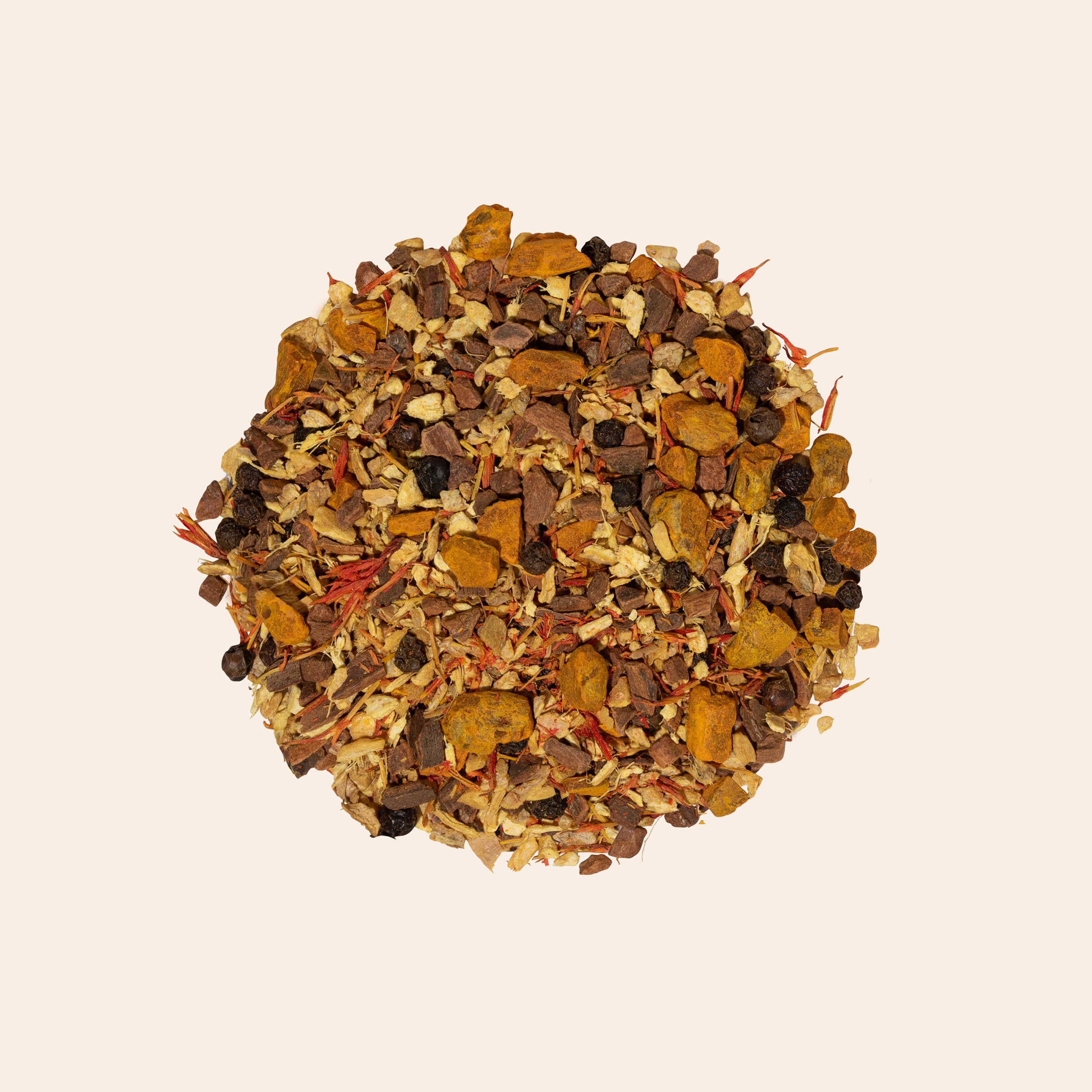 Gember brengt directe pit en levendigheid. Kurkuma geeft de blend zijn warme, gouden kern. Kaneel voegt een subtiele kruidige zoetheid toe en zwarte peper zorgt voor een lichte, spannende finish.