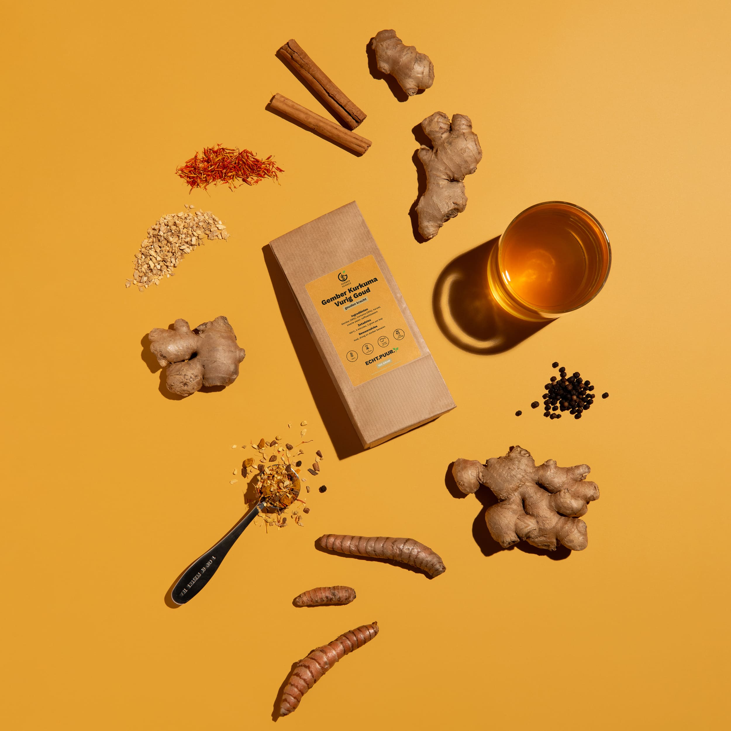 Vurig Goud is gemaakt voor liefhebbers van warmte en rijke smaak. De combinatie van gember (38%) en kurkuma (26%) vormt de krachtige basis van deze blend.